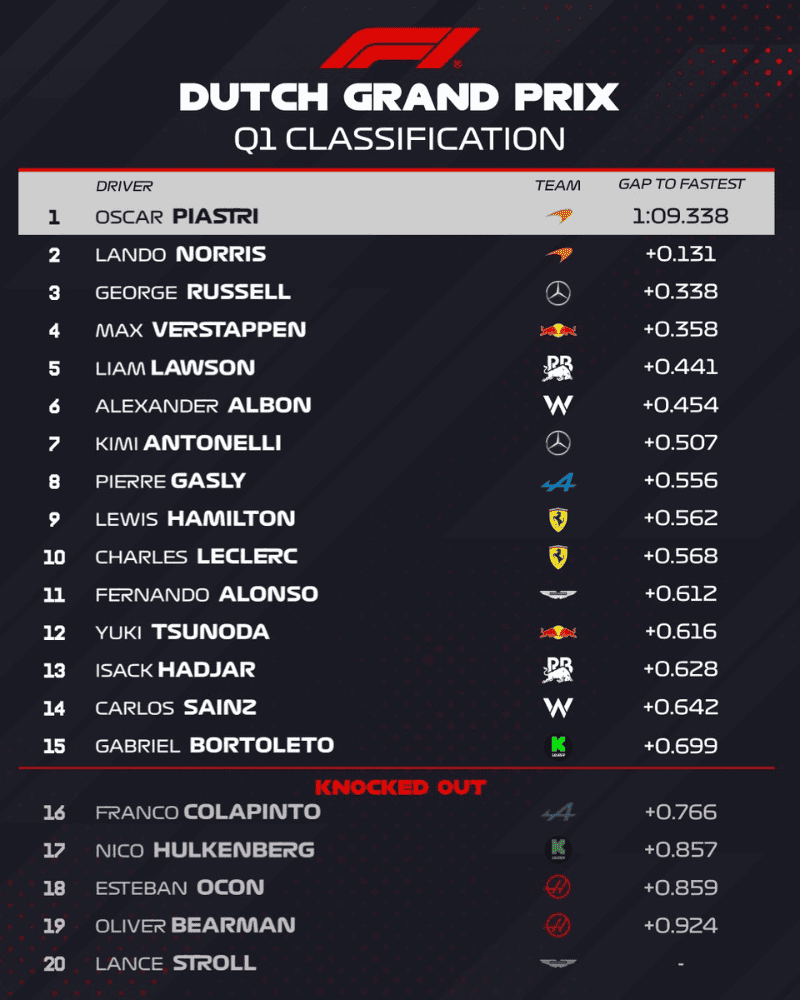 El oriundo de Pilar, quedó a apenas 0.067 del tiempo de corte en la Q1, pero no logró pasar la primera fase. En el 15.º lugar lo tuvo el brasileño Gabriel Bortoleto con su Sauber (1:10.037) y a apenas 0.210 de su compañero Pierre Gasly, que se posicionó octavo con 1:09.894.