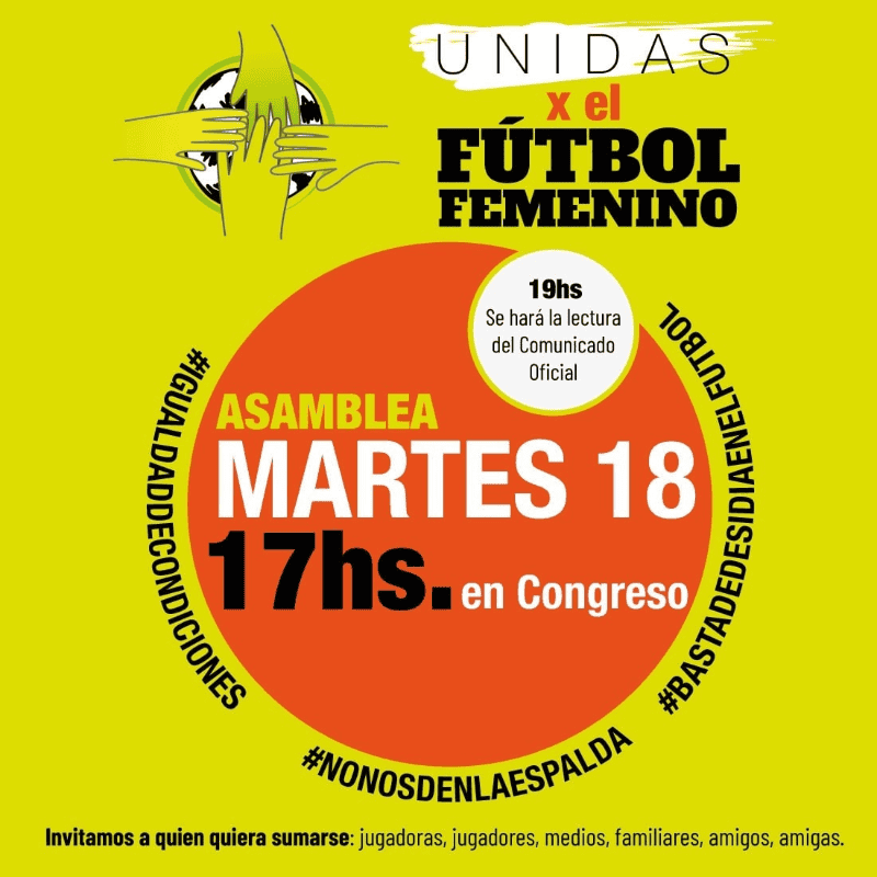 El martes 18 de octubre a las 17 horas frente al Congreso de la Nación, Jugadoras, Ex Jugadoras, Técnicas, desarrollarán una asamblea, unidas por tres consignas: “Igualdad de condiciones”, “Que no nos den la espalda”, y “Basta de desidia en el fútbol femenino”.
