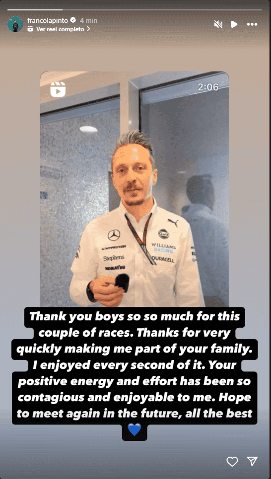 “Muchas gracias por este año. Hiciste un trabajo absolutamente increíble y es genial ver un poco de competitividad en el auto y llevarlo al límite. Muchas gracias y buena suerte”, dijo otro de los empleados de Williams. “Ha sido un absoluto placer verte competir al más alto nivel. Desde el momento en que llegaste al garaje, tu positividad se sintió en todo el equipo. Quiero agradecerte por eso. Te deseo lo mejor en el futuro, amigo”.