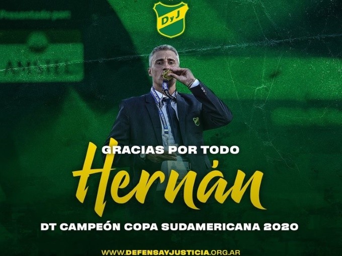 "Defensa y justicia agradece a Hernán Crespo y a todo su cuerpo técnico por el trabajo realizado en nuestra institución, donde dirigió a nuestro primer equipo hasta la obtención de nuestra primera conquista internacional, la Copa Conmebol Sudamericana 2020″, dice el escrito.