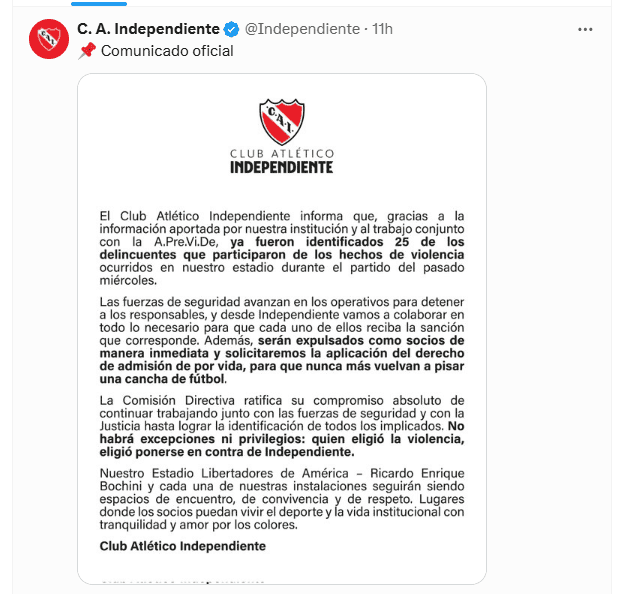 Mediante un comunicado, el club de Avellaneda indicó que "ya fueron identificados 25 de los delincuentes que participaron de los hechos de violencia", y que "las fuerzas de seguridad avanzan en los operativos para detener a los responsables".