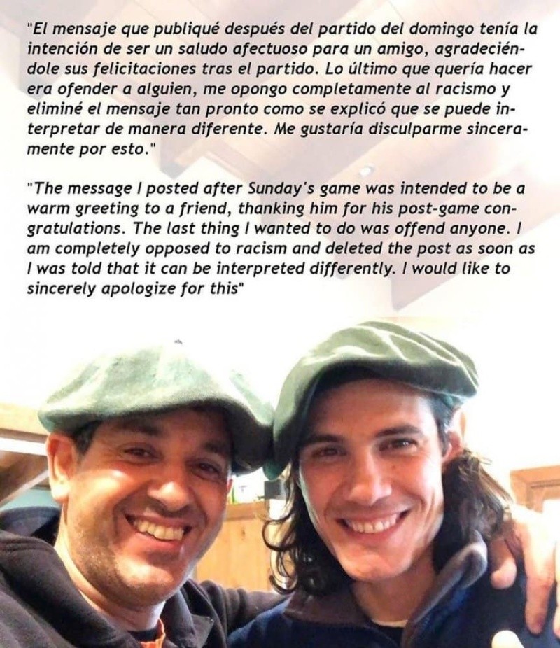 Al mismo tiempo, emitió unas disculpas: "El mensaje que publiqué después del partido del domingo tenía la intención de ser un saludo afectuoso para un amigo, agradeciéndole sus felicitaciones tras el partido".