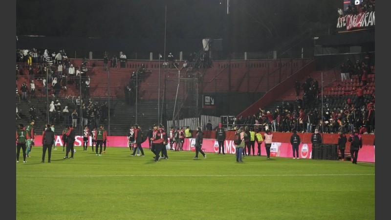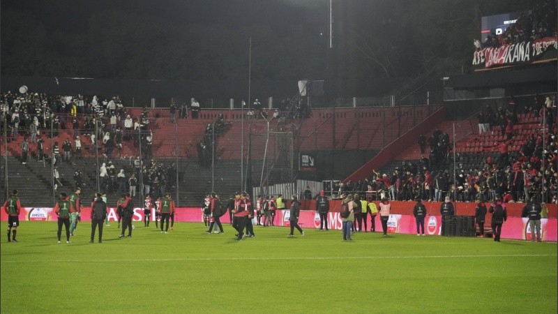 Algunos futbolistas de Newell's como Lucas Hoyos y Jorge Recalde se acercaron al alambrado detrás del arco para tratar de calmar los ánimos y posibilitar que siguiera el encuentro, algo que finalmente ocurrió unos diez minutos después.