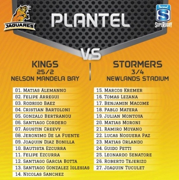 Los Jaguares jugarán por tercera vez ante Southern Kings, tras los dos partidos disputados en la temporada pasada (triunfo como local por 73 -27, y derrota como visitante por 22 a 29). Será la tercera vez que se midan frente a Stormers, tras el amistoso (14 -29) de pretemporada disputado el año último, y el partido correspondiente a la cuarta fecha (8-13) del Personal Súper Rugby 2016