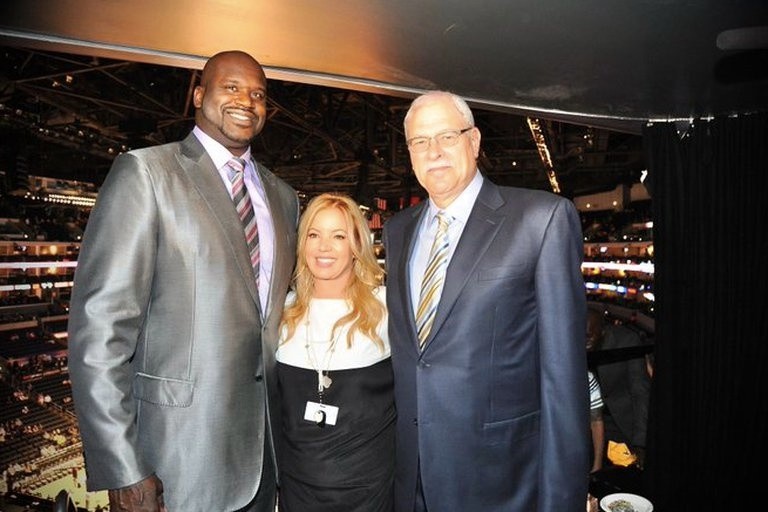 Jeanie Buss fue pareja del entrenador Phil Jackson (der.; Shaquille O'Neal a la izq.), quien llevó a los Lakers a cinco victorias. (@JeanieBuss/Twitter)