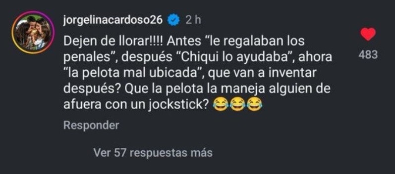 “¡Dejen de llorar! Antes ‘le regalaban los penales’, después ‘Chiqui lo ayudaba’, ahora ‘la pelota mal ubicada’. ¿Qué van a inventar después? ¿Qué la pelota la maneja alguien de afuera con un joystick?”, escribió.