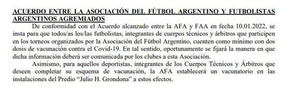La Asociación del Fútbol Argentino (AFA) comunicó el viernes que llegó a un acuerdo con Futbolistas Argentinos Agremiados para instar a jugadores, cuerpos técnicos y árbitros a que presenten el esquema completo de vacunación contra el coronavirus.