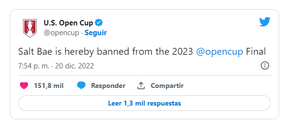 La situación fue tan lamentable que ahora un torneo americano canceló al chef turco. La organización de la U.S. Open Cup uno de los principales torneos de fútbol en Estados Unidos, anunció que será “persona no grata” en la final del evento en 2023.