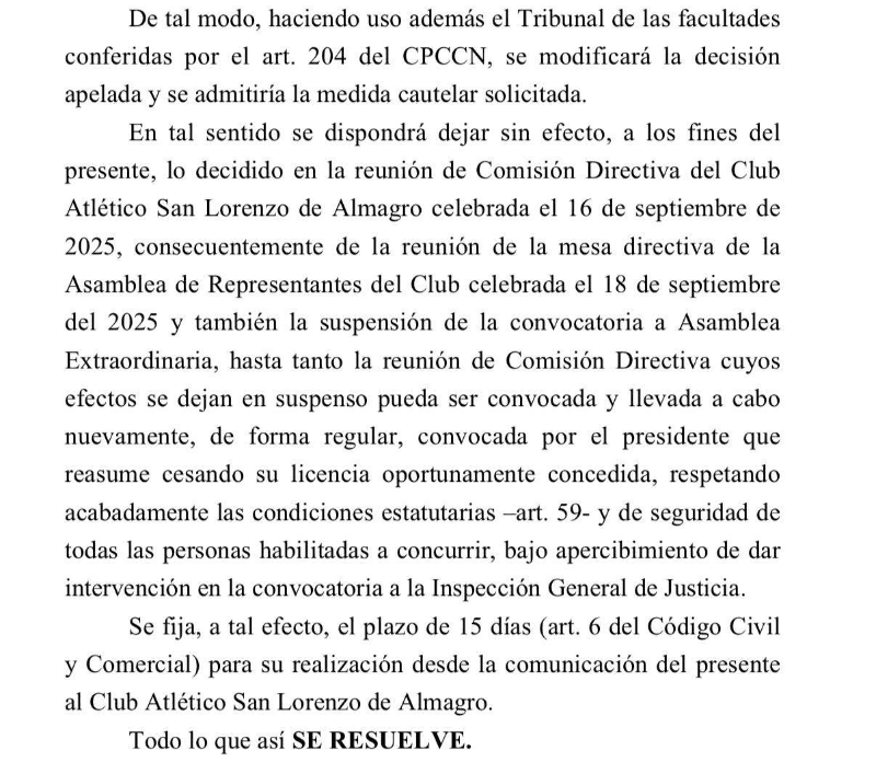 En línea con estas dos resoluciones, la Cámara Civil dictaminó que "el presidente reasume cesando su licencia oportunamente concedida" y que el propio Moretti será quien tenga que convocar, organizar y llevar a cabo la reunión de Comisión Directiva en la fecha que el propio presidente considere.