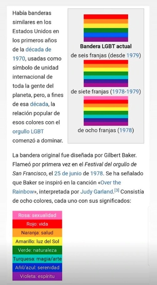 “La bandera original fue diseñada por Gilbert Baker. Flameó por primera vez en el festival del orgullo gay en San Francisco, el 25 de junio de 1978. Se ha señalado que Baker se inspiró en la canción "Over the Rainbow", interpretada por Judy Garland. Consistía de ocho colores, cada uno con sus significados: Rosa=Sexualidad, Rojo=Vida, Naranja=Salud, Amarillo=Luz del Sol, Verde=Naturaleza, Turquesa=Magia y Arte, Azul=Serenidad y Violeta=Espíritu”, completó Guzmán.