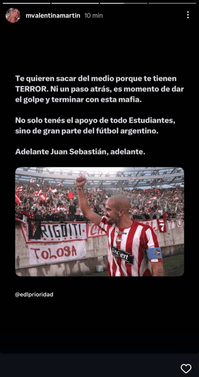 En la siguiente publicación, Martin sostuvo que a Verón lo “quieren sacar del medio” porque le “tienen terror”. Aseguró que es “momento de dar el golpe y terminar con esta mafia” y le manifestó su apoyo: “No solo tenés el apoyo de todo Estudiantes, sino de gran parte del fútbol argentino. Adelante Juan Sebastián, adelante”. Minutos después, cerró sus redes sociales.