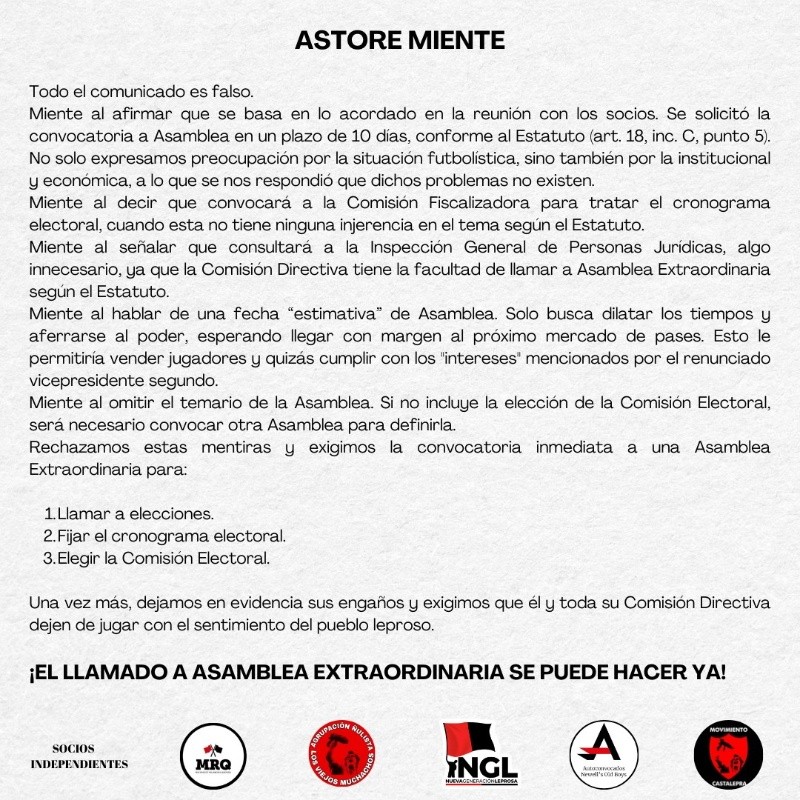 "Todo el comunicado es falso", dice a modo de introducción el texto que firman Socios Independientes, Los viejos Muchachos, Nueva Generación Leprosa, Autoconvocados y Movimiento Castalepra. Esto ocurre luego de que las redes oficiales del club este jueves mostraran la postura de Ignacio Astore, tras la toma del club y las reiteradas manifestaciones de hinchas en la puerta del Coloso.