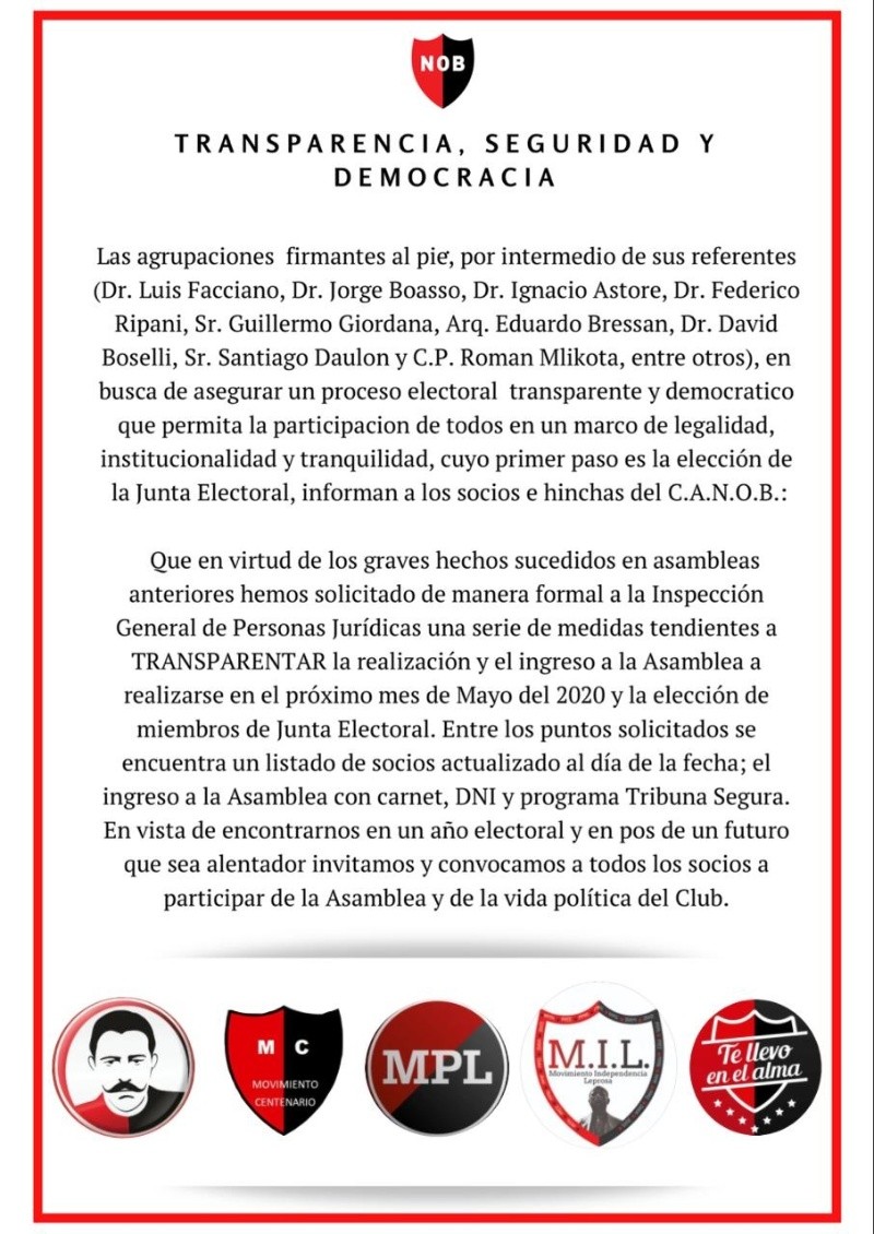 Este año serán las elecciones en Newell's Old Boys y ante la cercanía de la asamblea del próximo mes de mayo en la que se elegirá la Junta Electoral que fiscalizará los comicios de diciembre, la oposición se unió para reclamar "transparencia, seguridad y democracia".