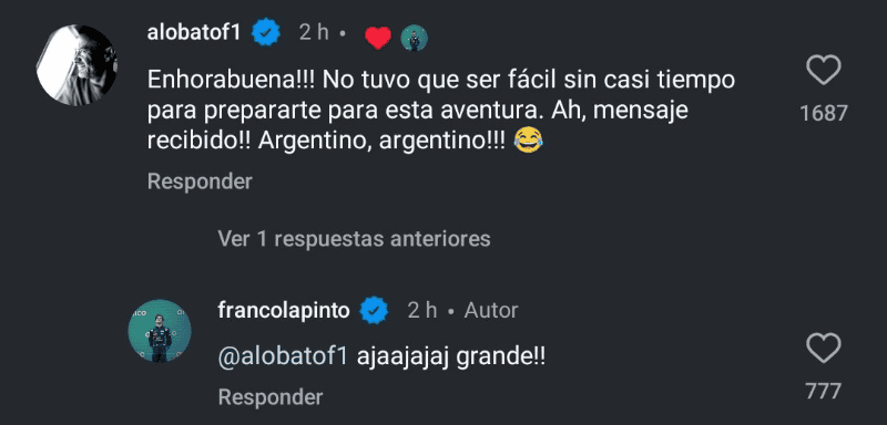 Por su parte, Lobato pidió disculpas en un análisis realizado en SoyMotor y tuvo una divertida interacción con el piloto en una de sus publicaciones luego de la carrera.