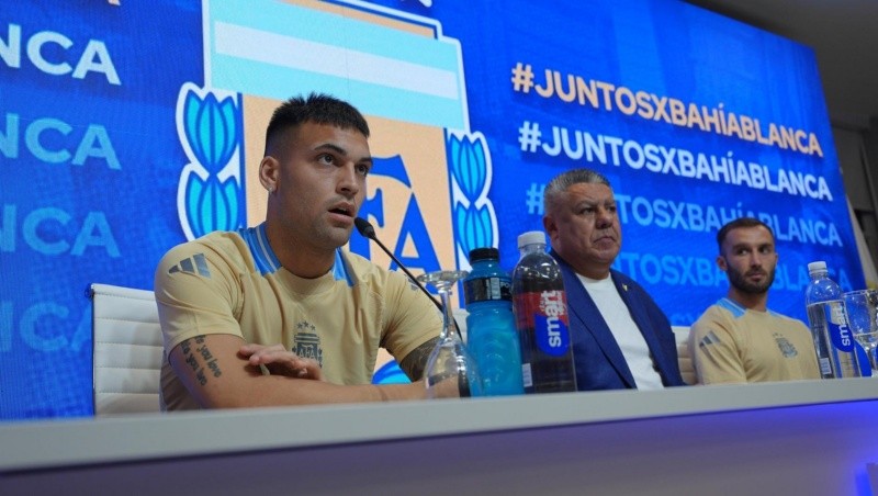 "Me cuesta hablar porque mi familia vive en Bahía", admitió el delantero Lautaro Martínez, presente en la conferencia junto al defensor Germán Pezzella y al presidente de la Asociación del Fútbol Argentino (AFA), Claudio Tapia.