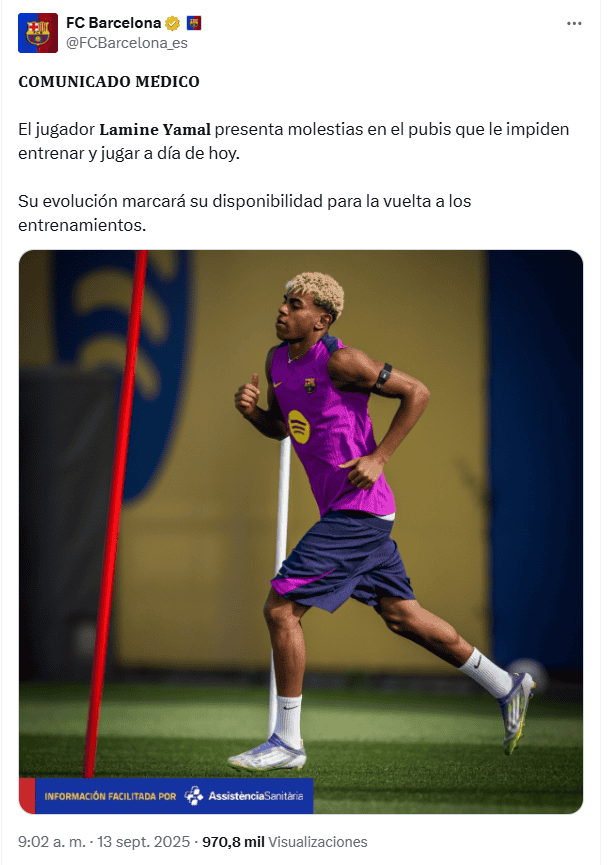 Para confirmar el tipo de lesión de Lamine, tuvo que acudir al encargado de la prensa que lo acompañaba en la rueda de prensa, quien confirmó: "Tiene unas pequeñas molestias en el púbis, se le han hecho pruebas y evidentemente no estará disponible para el siguiente partido y será duda para el Newcastle".