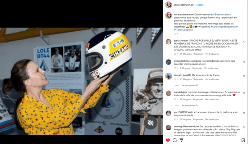 "Con mi hermana y @damonrelatorr guardamos este secreto porque fueron muy respetuosos en pedirnos el permiso. Nos parece que es un lindísimo homenaje para todos los argentinos", publicó Cora en su cuenta de Instagram. Además, en ese mismo posteo, puso una foto del mítico casco que usó su papá, que fue piloto de la escudería Williams desde 1980 hasta 1982, cuando se retiró de la Fórmula 1 y probó suerte en el Rally.