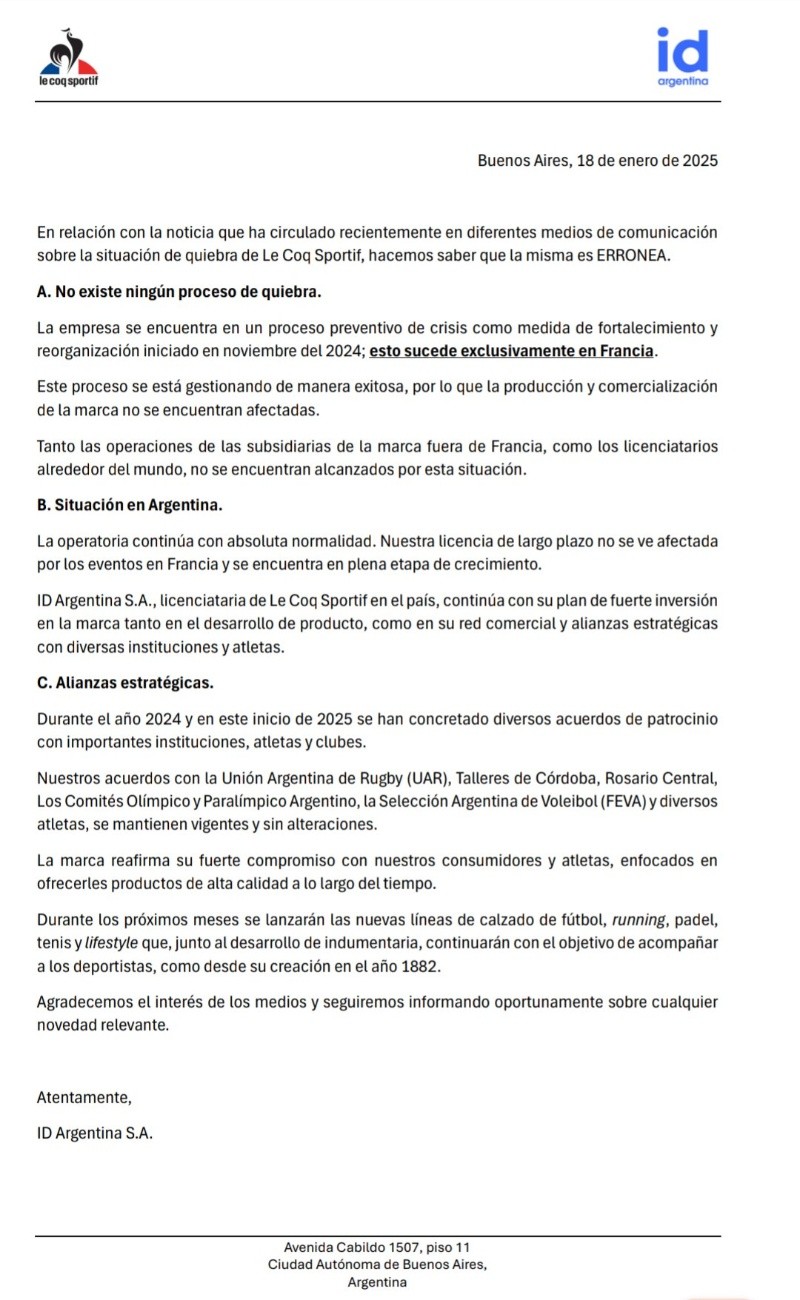 Entre los puntos más salientes de la comunicación, ID Argentina resalta que “no existe ningún proceso de quiebra” y se refiere a que “la empresa (Le Coq Sportif) se encuentra en un proceso preventivo de crisis como medida de fortalecimiento y reorganización iniciado en noviembre del 2024; esto sucede exclusivamente en Francia”.