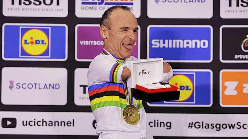 En el Mundial de Ciclismo Paralímpico en Glasgow, le regalaron al ganador de la competencia, un ciclista sin brazos, un reloj de pulsera. El protagonista, el ciclista Ricardo Ten, reaccionó con ironía mostrando su obsequio en una imagen.