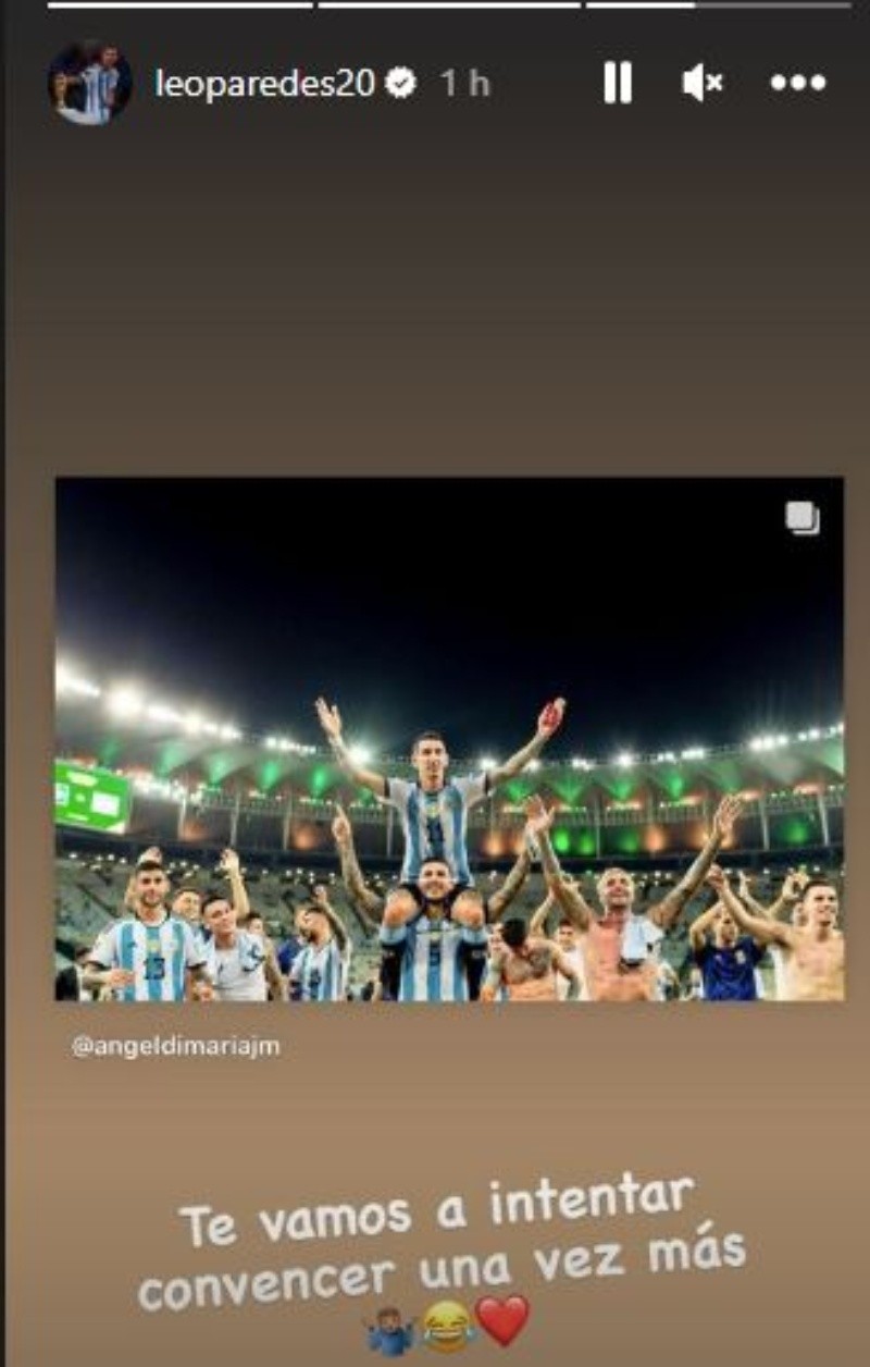 Otro que se mostró agradecido con Di María fue Leandro Paredes. "Gracias por absolutamente todo amigo mio, te amo", escribió y subió a su perfil una foto juntos donde sumó: "Te vamos a intentar convencer una vez más". Y en el mismo hilo, "Inmenso fide. Gracias toda la vida", agregó el jugador Lautaro Martinez.