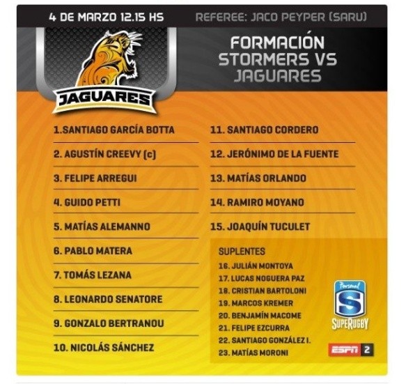 Los Jaguares se preparan para el segundo partido del año en el Súper Rugby. Será ante Stormers este sábado a las 12.15 del mediodía, hora argentina, con la presencia de rosarinos en el equipo titular.