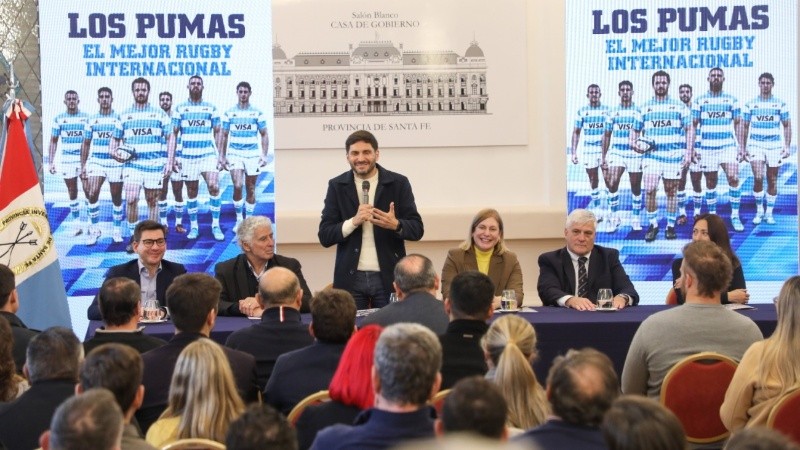 El gobernador Maximiliano Pullaro, acompañado por el presidente de la Unión Argentina de Rugby, Gabriel Travaglini, presentó oficialmente el partido por el Rugby Championship entre Los Pumas y Australia que se disputará el sábado 7 de septiembre en el estadio Brigadier López de la ciudad de Santa Fe.