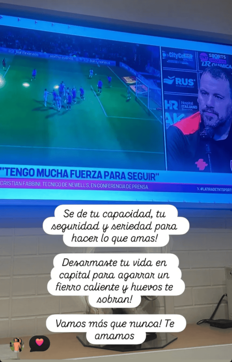 Mientras el Ogro hablaba en conferencia de prensa, su mujer posteó otra historia en Instagram: "Se de tu capacidad, de tu seguridad y seriedad para hacer lo que amas. Desarmaste tu vida en capital para agarrar un fierro caliente y huevos te sobran. Vamos más que nunca. Te amamos".