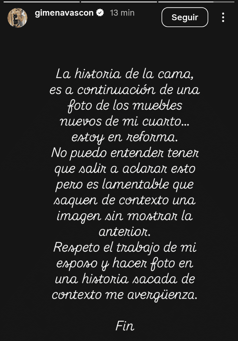 Luego en su último post, aclaró que la foto de la cama la "sacaron de contexto". "Respeto el trabajo de mi esposo y hacer foto en una historia sacada de contexto, me avergüenza".