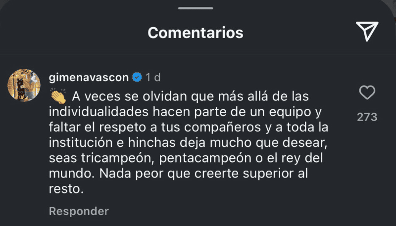 No es la primera vez que la mujer de Fabbiani hace referencia en redes a alguna situación conflictiva de Newell’s. Cuando Keylor Navas decidió irse, Vascón lo cuestionó en Instagram: "A veces se olvidan que son parte de un equipo y faltar el respeto a tus compañeros, una institución e hinchas deja mucho que desear por más que seas tricampeón, pentacampeón o el rey del mundo. Nada peor que creerte superior al resto".