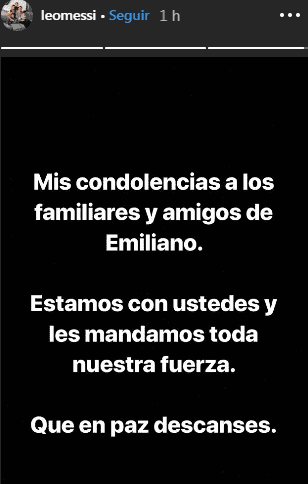 Messi también usó Instagram, y en una historia escribió: "Mis condolencias a los familiares y amigos de Emiliano. Estamos con ustedes y les mandamos toda nuestra fuerza. Que en paz descanses".