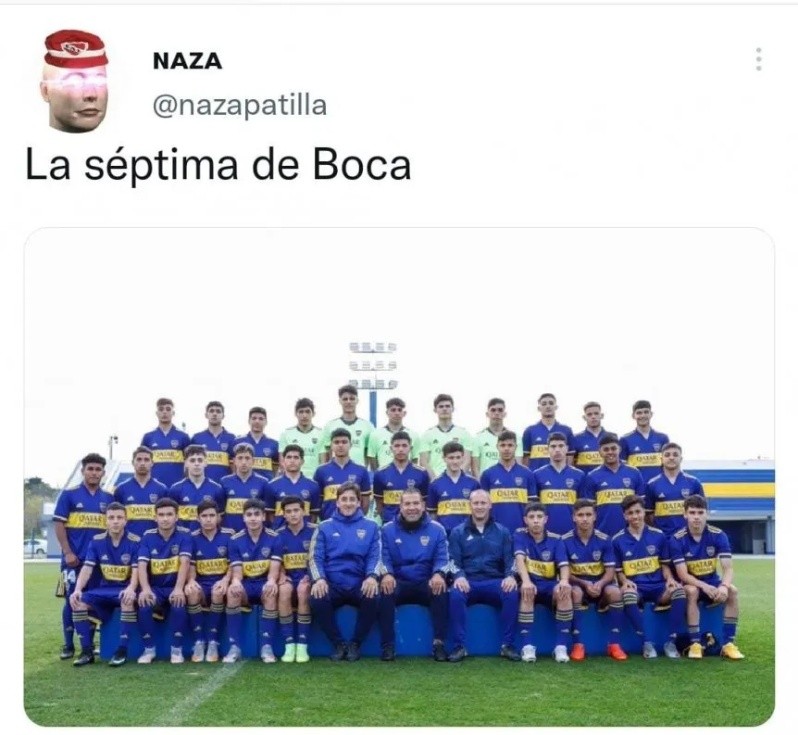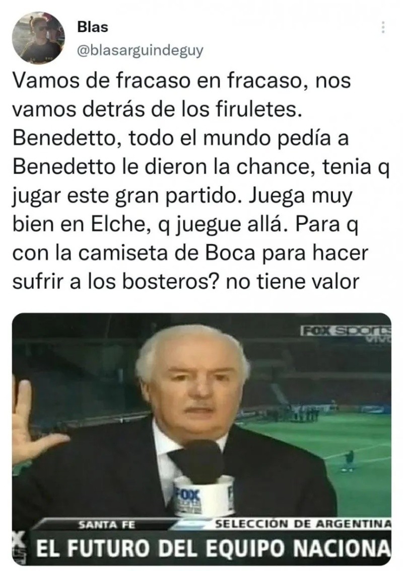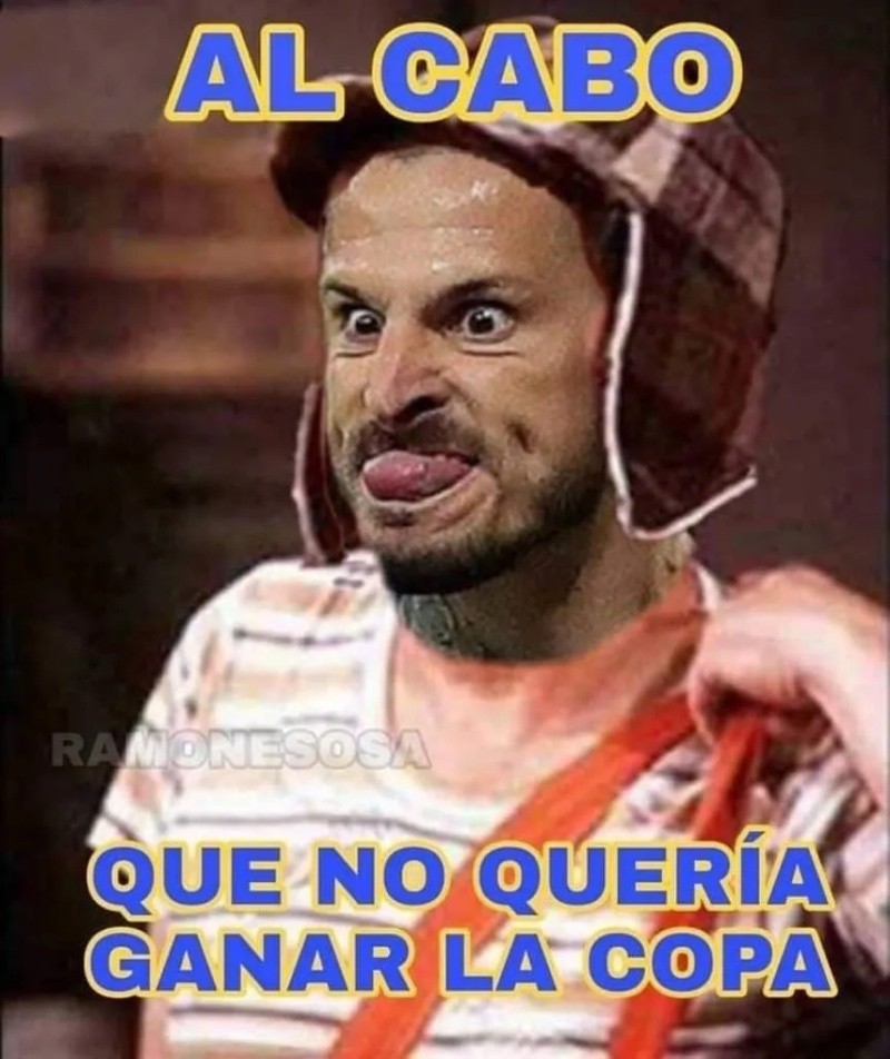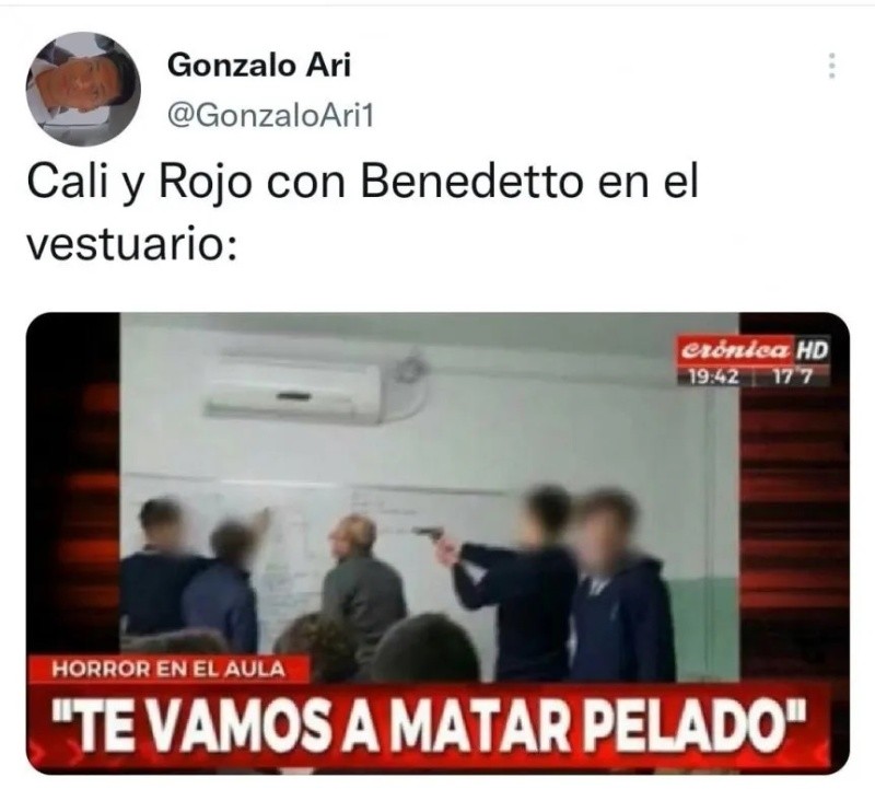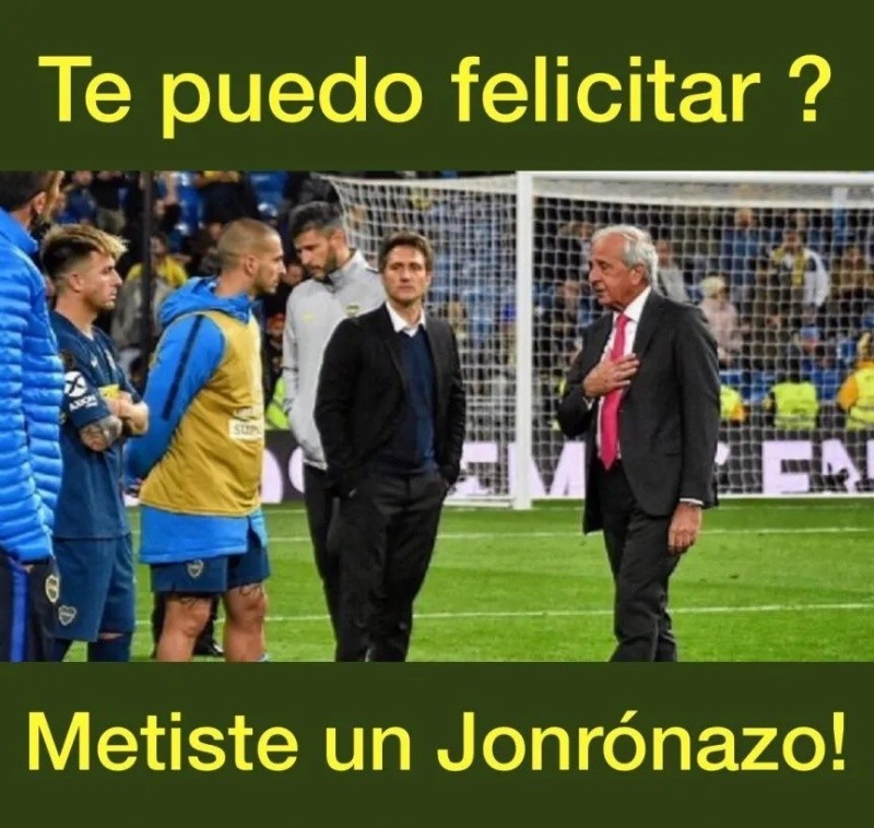 Una de las ocurrencias, utilizando una recordada editorial del periodista Fernando Niembro. El meme de Rodolfo D'Onofrio, presidente de River, y Benedetto, con la foto de la final que River le ganó a Boca en Madrid por la Libertadores. Boca buscaba su séptima Copa Libertadores, pero otra vez quedó en el camino.