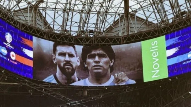 Según imágenes que se viralizaron en las redes sociales, en el estadio decidieron homenajear al "Diez" con una imagen en pantalla gigante, junto a Lionel Messi. Sí, los dos mejores futbolistas de la historia, presentes en Estados Unidos.