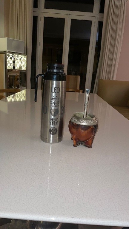 Se trata de un equipo de mate que consta de un termo en el que aparece el apodo de Leo y abajo los escudos de la selección Argentina, Newell’s, el Barcelona y ahora también el PSG, su actual club. Además, a los costados de los escudos, se puede ver el número “10” con el que el rosarino juega en el combinado albiceleste y también en el club catalán y el “30” con el que debutó en París.