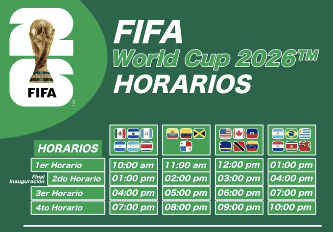La hora exacta de cada encuentro se conocerá luego del sorteo, ya que dependerá del grupo que le toque al equipo nacional y del calendario de la fase de grupos.
