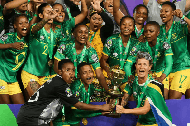 La selección sudafricana jugó su primer partido oficial el 30 de mayo de 1993, venciendo en un amistoso a Suazilandia por 14-0. Nunca superó la fase de grupos de un mundial o los Juegos Olímpicos, mientras que su mayor logro fue conquistar la Copa Africana de Naciones 2022. A pesar de ser las últimas campeonas, en la previa de la copa del mundo, las jugadoras de la selección le hicieron frente a la Asociación de Fútbol de Sudáfrica (SAFA).
