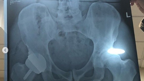 "Ahora tengo una cadera de metal como se puede ver en la segunda foto", escribió en su mensaje, con la imagen de la radiografía.