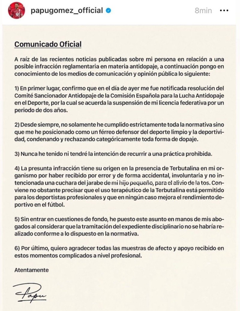 El atacante argentino Alejandro "Papu" Gómez aseguró este domingo que su doping positivo, por el cual recibió dos años de suspensión para la práctica del fútbol profesional, se produjo "por error, de forma accidental, involuntaria y no intencionada".