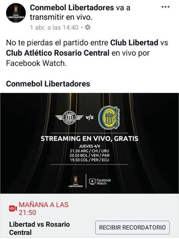 En caso de realizar la búsqueda desde el celular, al iniciar la aplicación Facebook se debe ubicar en el segundo ícono de izquierda a derecha que simula una pantalla con un play. Dicho ícono es el de Watch. Al ingresar hay que escribir en el buscador "Conmebol Libertadores Central" y en los resultados aparecerá el anuncio del partido de este jueves.