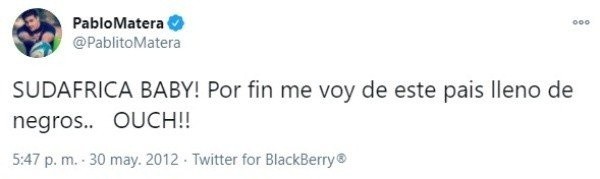 Así, tras el pedido de disculpas público que encabezó justamente Matera, explotaron las redes sociales por sus textos del 2011 y 2012: “Que linda mañana para salir a pisar negros”, dice uno de ellos y otro en los que refiere a su salida del país: “¡Sudafrica Baby! Por fin me voy de este país lleno de negros... Ouch!”