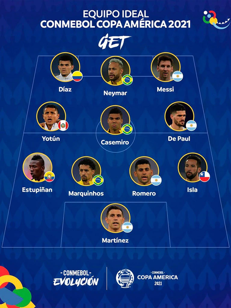 El equipo se completó con el chileno Mauricio Isla, el brasileño Marquinhos y el ecuatoriano Pervis Estupiñán. En el mediocampo, Casemiro y el peruano Yoshimar Yotún los que acompañaron a De Paul. Y arriba Neymar estuvo junto a Messi y la gran revelación del certamen: el colombiano Luis Fernando Díaz, que terminó como máximo artillero junto al 10 de Argentina (4 gritos cada uno).