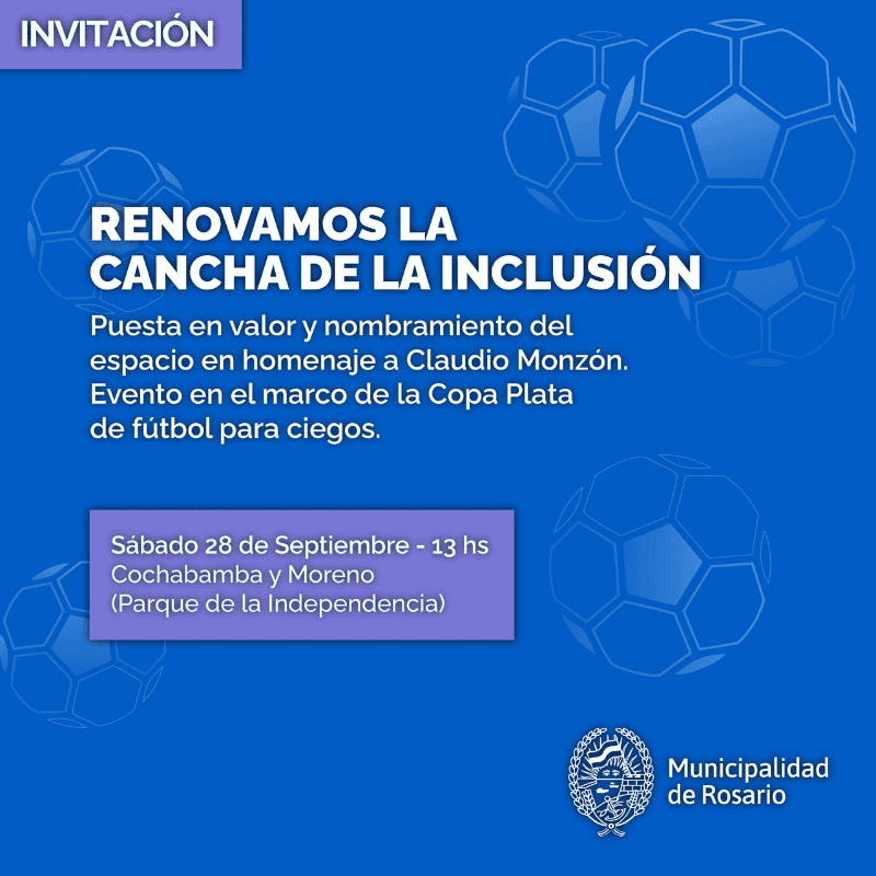 Un paso más para el deporte y la inclusión. Este sábado, desde las 13, con entrada libre y gratuita, reinaugurarán la cancha de la inclusión, ubicada en Cochabamba y Moreno, en la zona del Parque Independencia. La misma fue modificada y reformada con obras hace algunos meses y también le modificarán el nombre en homenaje a un ex jugador rosarino de Murciélagos, equipo de la selección argentina de fútbol para ciegos.