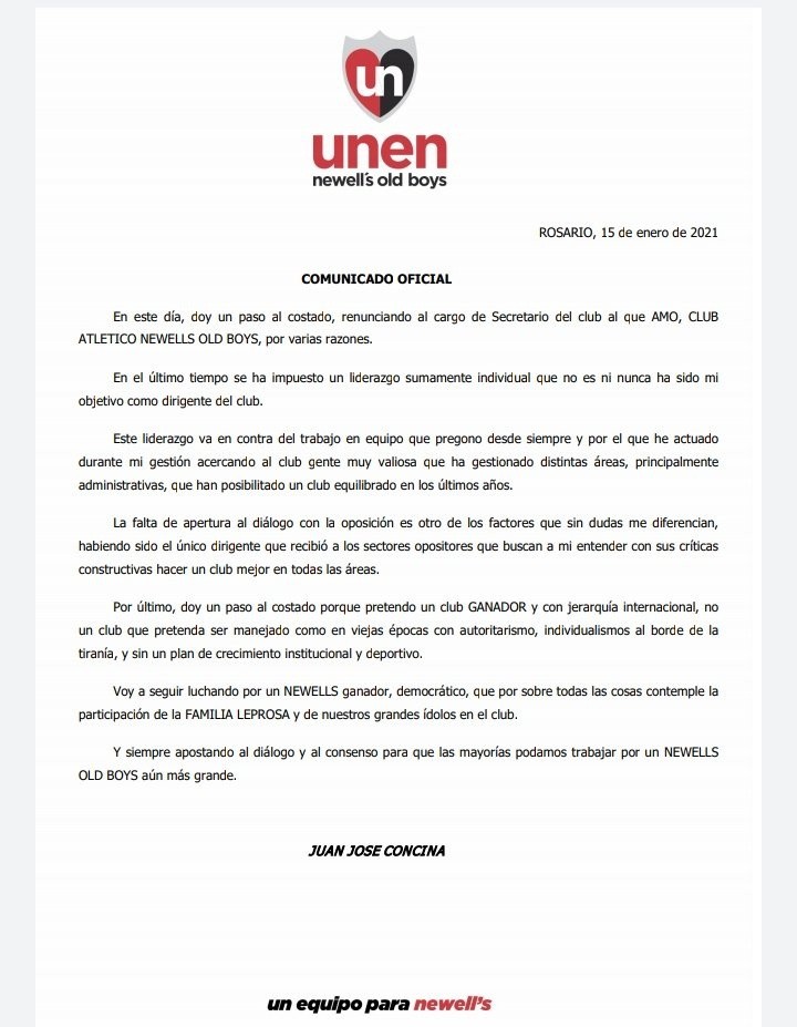 "En este día, doy un paso al costado, renunciando al cargo de secretario del club que amo", comienza diciendo Juan José Concina. Y después el escrito se torna muy duro hacia la actual gestión, de la que ya no forma parte: "En el último tiempo se ha impuesto un liderazgo sumamente individual que no es ni nunca ha sido mi objetivo como dirigente del club", continuó el ahora ex dirigente de Newell's.