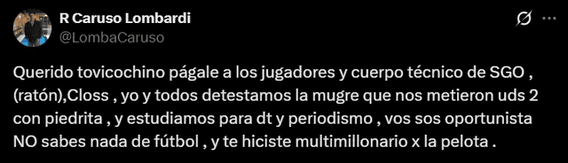 En su respuesta, Caruso bregó por el pago de los premios adeudados a los jugadores y cuerpo técnico de Central Córdoba de Santiago del Estero, ya que en la semana el entrenador Omar De Felippe había reclamado no haber cobrado los mismos, trató a Toviggino de “ratón” y afirmó que odia “la mugre” que metió en el fútbol argentino, como mano derecha del presidente de AFA, Chiqui Tapia.