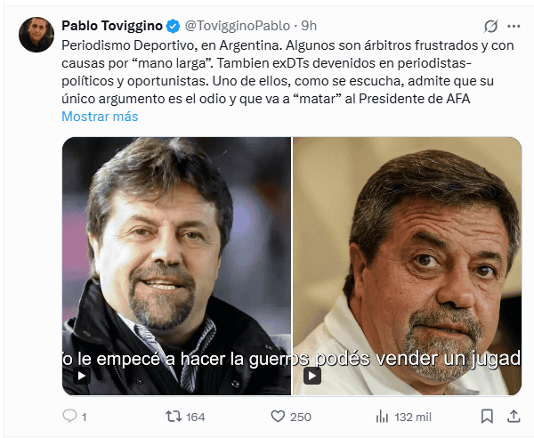 En la noche del miércoles, Toviggino había realizado una publicación tratando al DT de “extorsionador” y “oportunista”, afirmando que “su único argumento es el odio” y acusándolo de querer “matar al presidente de AFA porque nunca lo llamó”, además de considerarlo un “odiador del fútbol argentino y lo popular”.