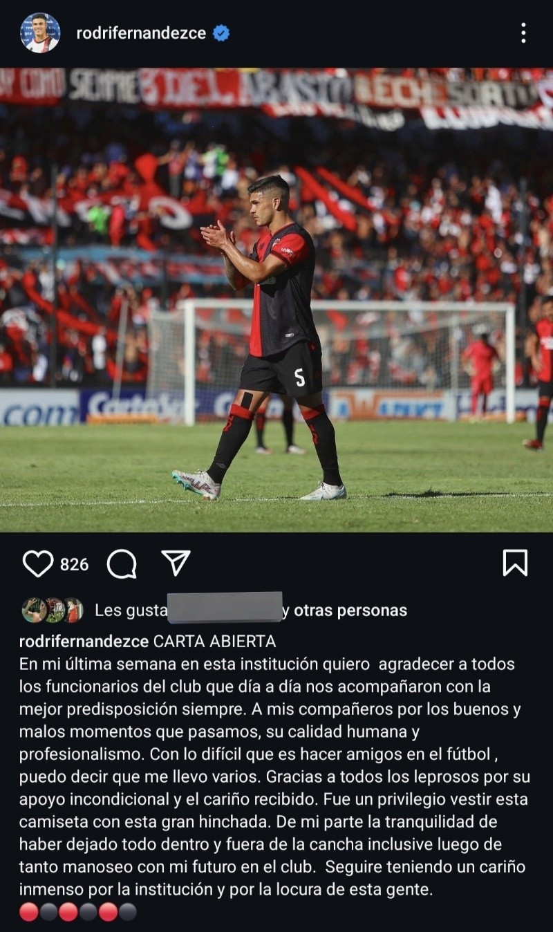 El año de Newell's llega a su fin y algunos de sus futbolistas empiezan a decir adiós. Es el caso de Rodrigo Fernández Cedrés, quien publicó una carta abierta para despedirse de los hinchas rojinegros y de sus compañeros.
