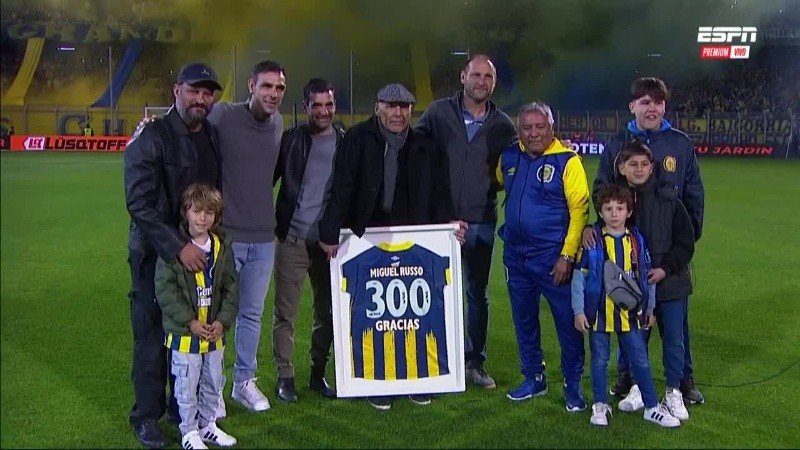 Una vez que los jugadores ingresaron al campo de juego de un estadio a estallar, cinco exjugadores canallas a los que el DT dirigió lo esperaron en el círculo central para regalarle una camiseta con el número 300 en la espalda: estaban Omar Palma, Ezequiel González, Horacio Carbonari, Paulo Ferrari y Germán Herrera.