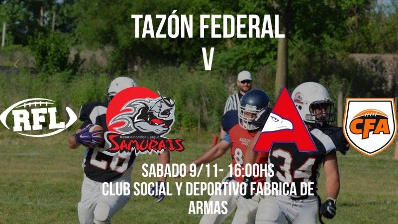 Se viene una nueva jornada a pura adrenalina en el Club Fábrica de Armas, de la zona sur de Rosario. Este sábado, a partir de las 16, chocarán Samurais, el seleccionado rosarino de football americano, contra Águilas, su par de Córdoba. Estará en juego el Tazón Federal V.