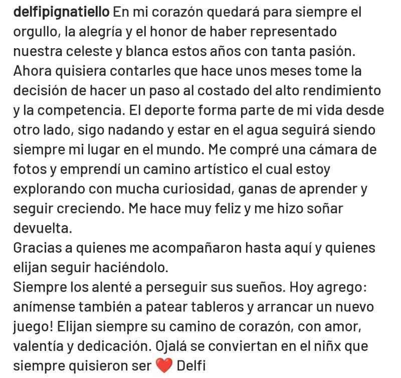 "En mi corazón quedará para siempre el orgullo, la alegría y el honor de haber representado nuestra celeste y blanca estos años con tanta pasión", expresó Pignatiello, quien conquistó tres medallas doradas en los Juegos Panamericanos de Lima 2019. Y añadió: "El deporte forma parte de mi vida desde otro lado, sigo nadando y estar en el agua seguirá siendo siempre mi lugar en el mundo".