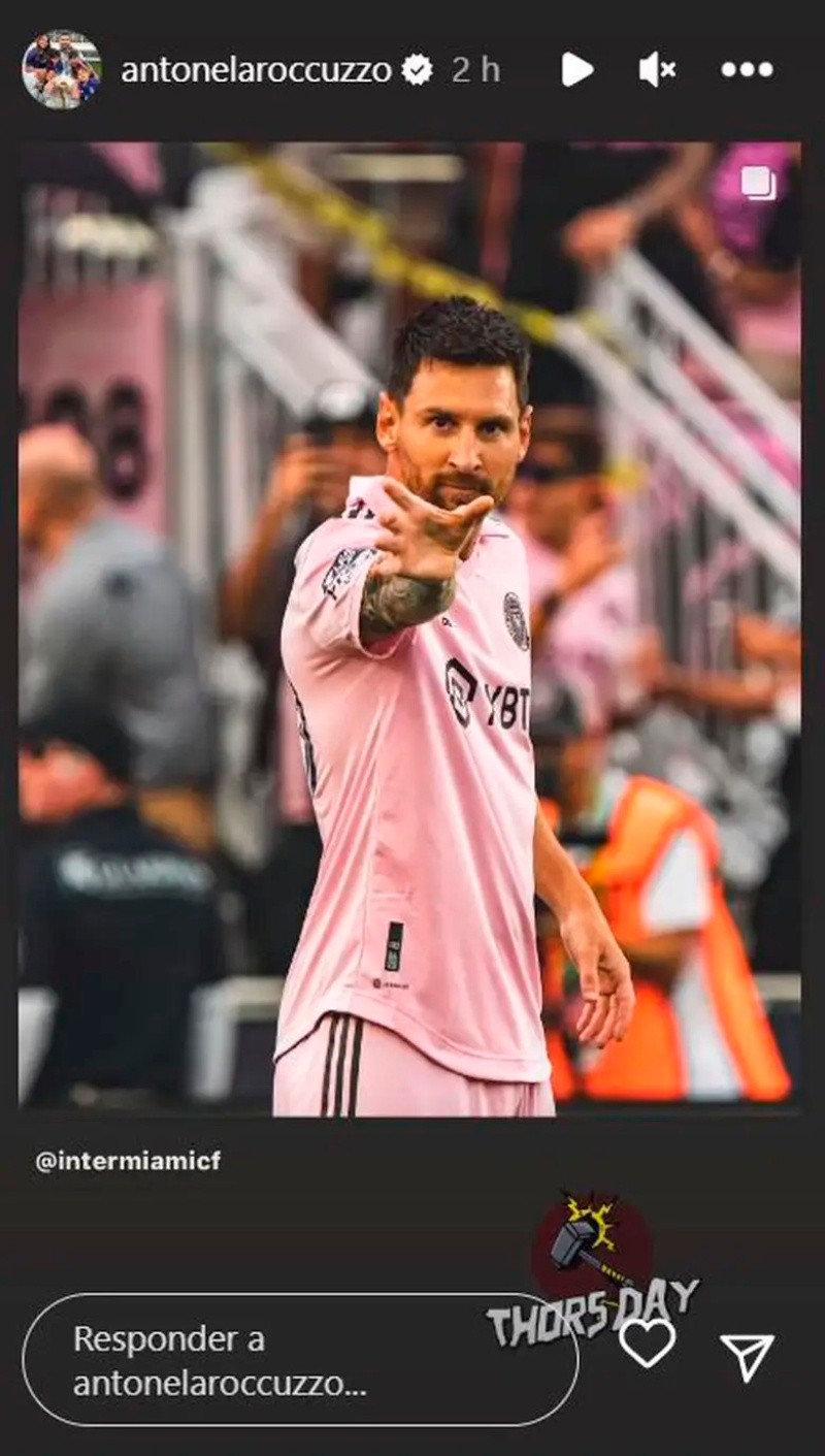 Hace unas semanas se pudo ver una camiseta del club del Estado de Florida con una imagen del Capitán América. Pero en este caso el gesto tiene que ver con otro de los Avengers: nada menos que Thor, cuando solicita el Mjölnir. Quien se encargó de reflejarlo fue Antonela Roccuzzo, que publicó en Instagram una historia con la imagen de su esposo y añadió un sticker de "Thor's Day".