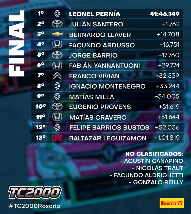 El tandilense Leonel Pernía, con Renault Fluence, ganó este domingo la final del TC2000, que por la primera fecha del campeonato de la especialidad, se disputó en el autódromo rosarino "Juan Manuel Fangio", en la que el arrecifeño Agustín Canapino (Chevrolet Cruze), desertó cuando marchaba en punta.